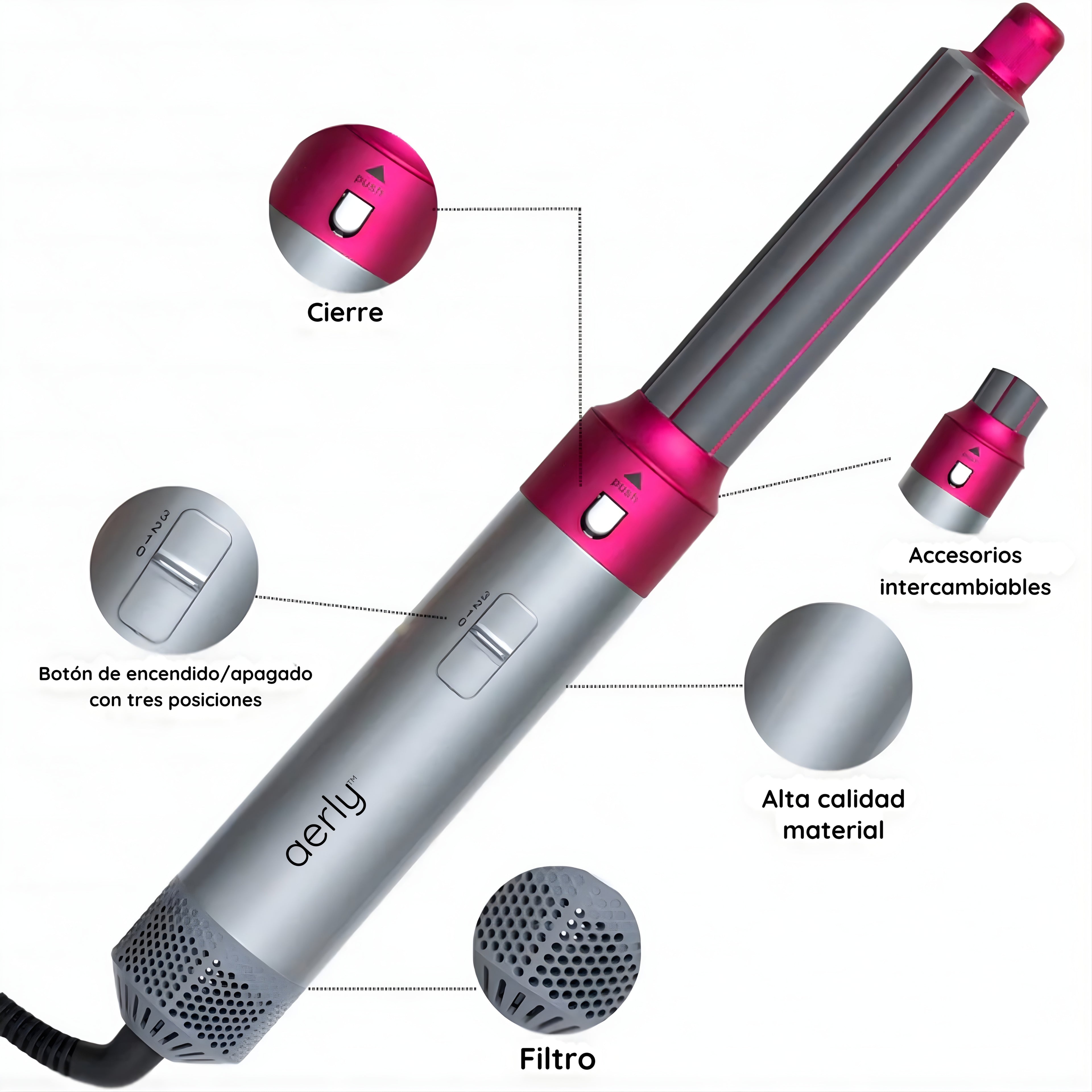 ¡El Aerly™ AirStyler lo hace todo por ti! Cambia de modo, ya sea Seco, Alisado, Rizos mágicos u Ondas, usando sus 5 accesorios diferentes con solo presionar un botón. ¡Genial, verdad?